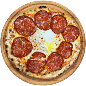 Sauce tomate, Mozzarella, salami piquant, oeuf