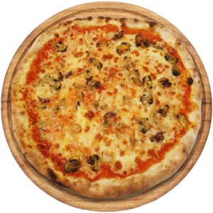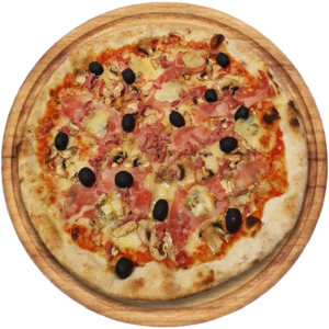 Sauce tomate, Mozzarella, jambon, artichauts, olives, champignons