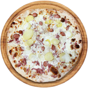 Créme, Mozzarella, lardons, knack, pomme de terre, oignons, parmesan