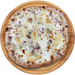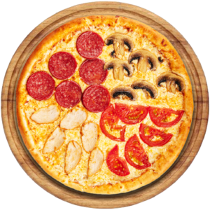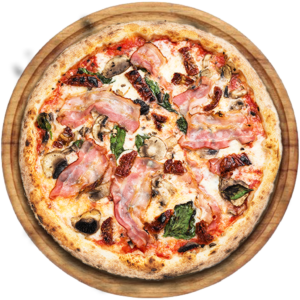 Sauce tomate, Mozzarella, jambon, lardons, gorgonzola, champignons, olives