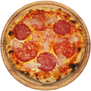 Sauce tomate, Mozzarella, jambon, chorizo, salami
