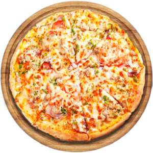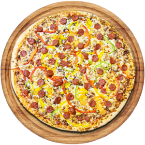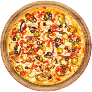 Sauce tomate, Mozzarella, champignons, artichauts, olives, oignons, poivrons, macedoine de legumes