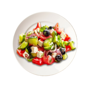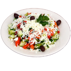 Tomates, cancombres, oignons, olives noires, fromage