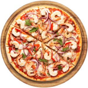 Sauce tomate, Mozzarella, scampis, fruits de mer, thon, saumon fume, oignons