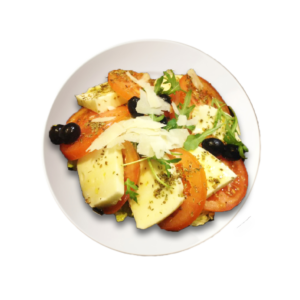 Salade iceberg, raquette, tomate, Mozzarella fraîche, basilic, huile d’olive, sauce vinaigrette