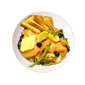 Toast chaud, saumon de fumée, salade iceberg, roquette, câpres, citron, oignon, sauce vinaigrette
