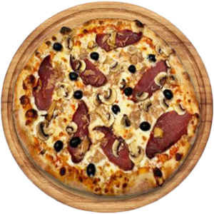 Sauce tomate, Mozzarella, thon, viande boeuf fumé, champignons, olives