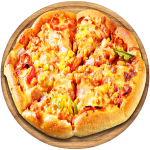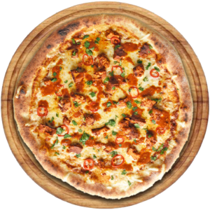 Sauce tomate, Mozzarella, poulet tikka, chorizo, poivrons, oignons, oeuf
