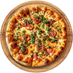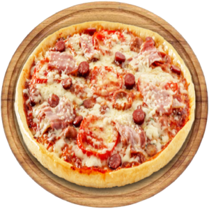 Sauce tomate, Mozarella, viande haché, lardons, oignons, tomates fraiches, parmesan