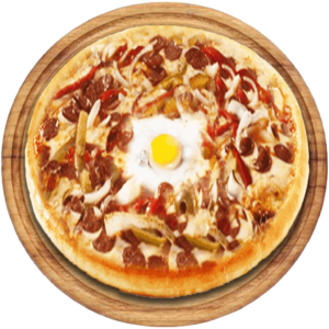 Sauce tomate, Mozzarella, poulet tikka, viande haché, merguez, poivrons, Œuf, oignons